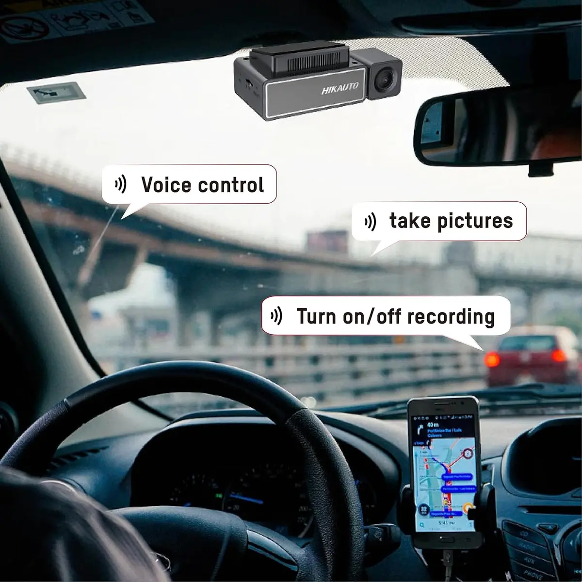 Manage your dashcam with voice: "Snapshot" to take pictures, "Video on/off" to start/stop recording.
