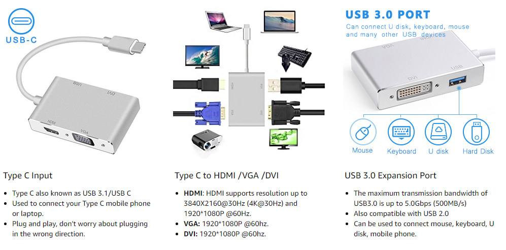 - 📺【4-IN-1 USB3.1(Type-C) to HDMI USB VGA DVI】 - HuiHeng USB C Multiple port for connecting PC/Laptop to HDMI/VGA/DVI-equipped monitors and displays. USB 3.0 port allows the connection with more USB devices such as Flash Drive, keyboard, mouse. The data-transfer speed is up to 5Gb/s(480MB/s). We provide 1 year product warranty.