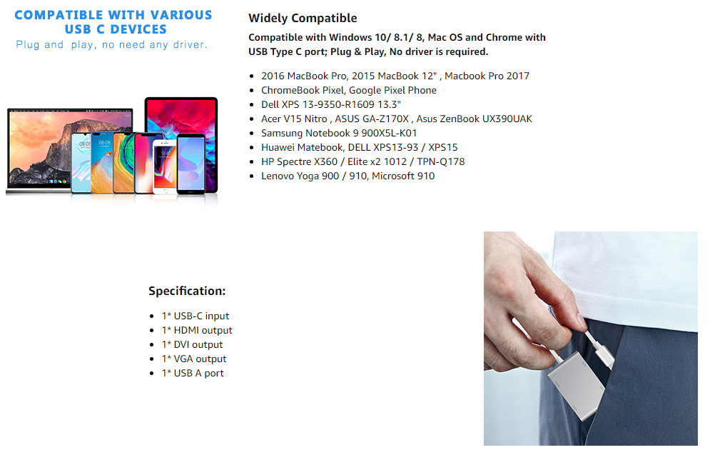 - 📺【 WIDE COMPATIBILITY】- Plug and play, no driver and power adapter required. Compatible with Windows 10/8.1/8, Mac OS, chrome or other Type C PC. Such as 2016/2017 MacBook, 2016 MacBook Pro, 2017 MacBook pro with Touch Bar, Dell XPS13/15, Dell Precision5510, HP Spectre X2, HP Spectre X360, HP Elitebook Folio G1, HP Elite X2 1012 G1, Acer Spin7, Acer Chromebook R13, Google Chromebook Pixel, Lenovo 900/910, HuaWei MateBook or Samsung s8/s8 plus.