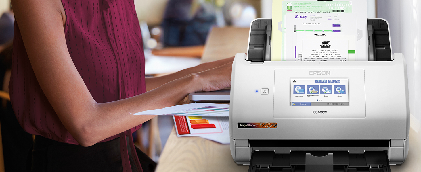 One of the smartest investments you can make for your business, the Epson RapidReceipt RR-600W business scanner, powered by ScanSmart AI PRO, enables you and your business to stay organized and efficient by unleashing the power of AI.