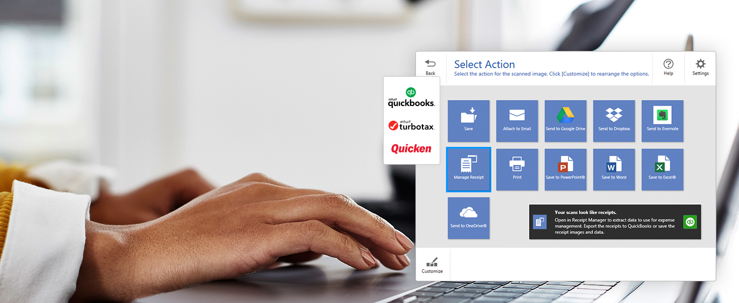 Going beyond simple document capture, the RapidReceipt RR-600W scanner utilizes an extensive data model of various invoices and receipts to quickly turn stacks of unorganized paperwork into categorized digital data that easily integrates into financial applications such as QuickBooks and TurboTax².