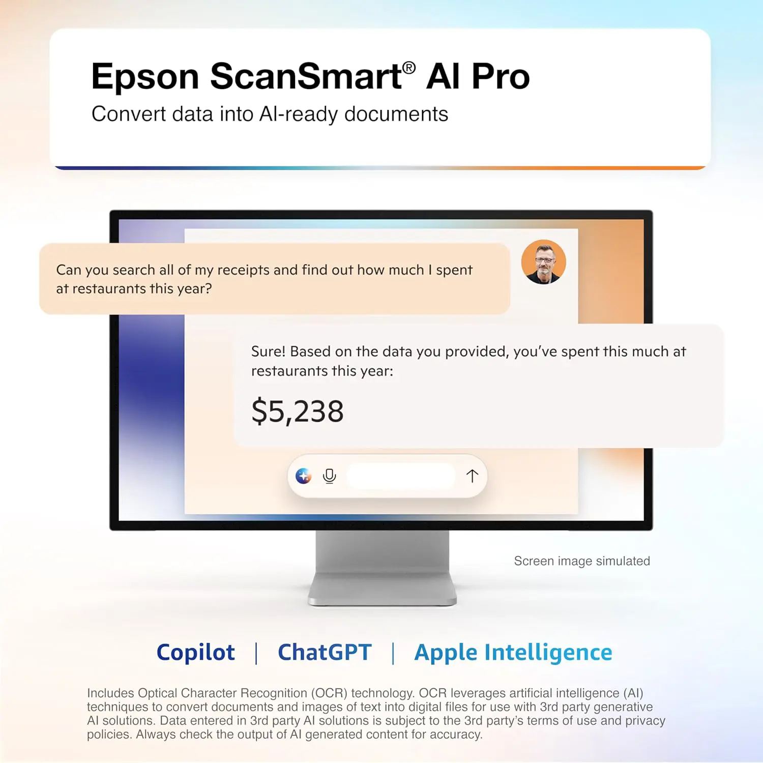 Driven by Epson ScanSmart AI PRO technology, you’ll quickly and intelligently convert scanned information into smart digital data – making your documents AI-ready for Microsoft Copilot, Apple Intelligence, ChatGPT workflows and more.