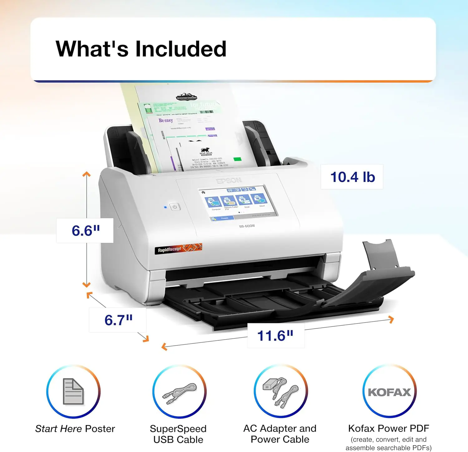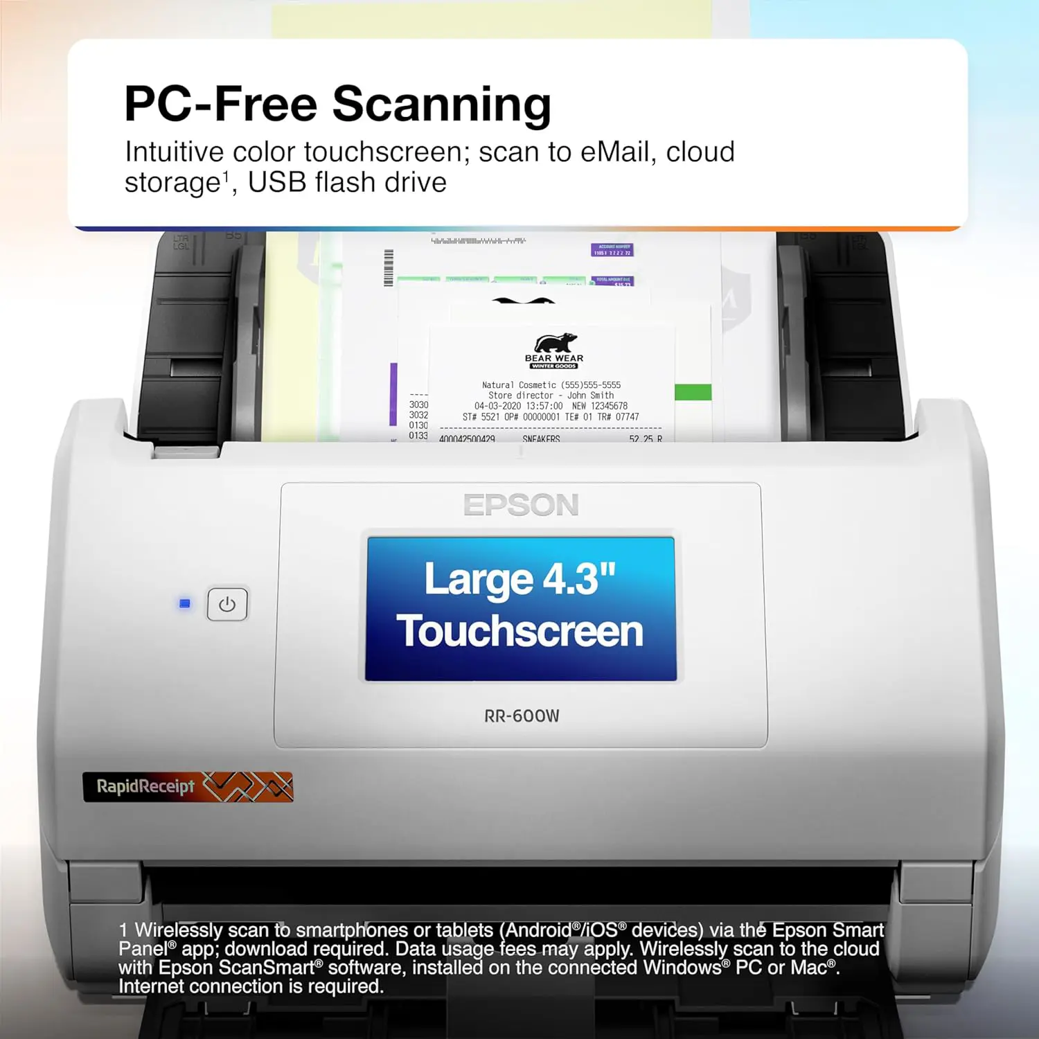 The RapidReceipt RR-600W helps increase your productivity with fast scanning up to 35 pages per minute³, delivering 10 times faster duplex scanning than a multifunction printer⁴. Plus, advanced features like a 100-page Automatic Document Feeder and the ability to create searchable and editable PDFs. While the built-in 4.3" color touchscreen allows for PC-free scanning directly to an email account, cloud service⁵ or USB drive.